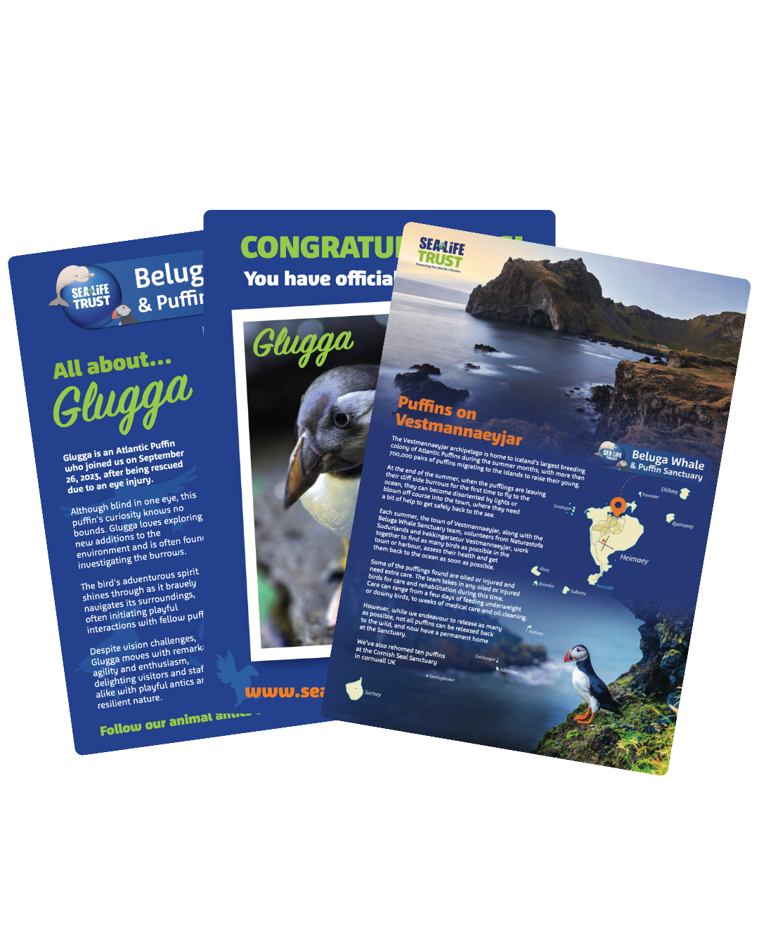 Meet Glugga, an Atlantic Puffin who overcame the challenges of an eye injury with remarkable resilience. Rescued on September 26, 2023, Glugga's adventurous spirit and unbounding curiosity continue to amaze us. This puffin loves exploring new environments and often surprises us with playful interactions with fellow puffins. Despite vision challenges, Glugga remains agile and spirited, delighting everyone who visits our sanctuary. Adopt Glugga today and support this little adventurer's journey!
